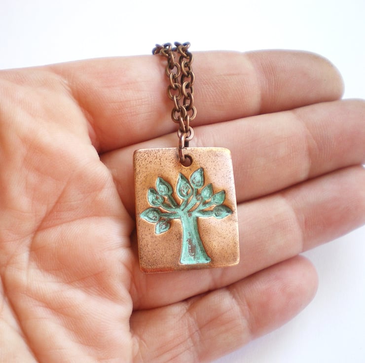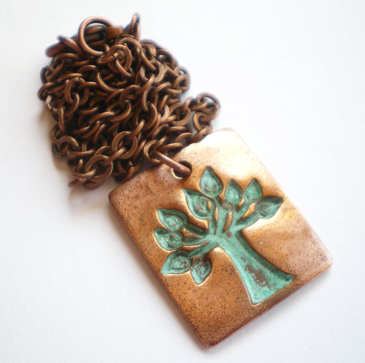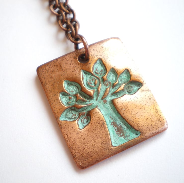 The pendant measures 2.5cm x 2.8cm and is hung on antiqued copper chain, closed with a bolt clasp. The copper has been given a verdigris patina and then polished up to make the tree of life really stand out. Finally I coat the copper with jeweller's lacquer to protect against discolouration.