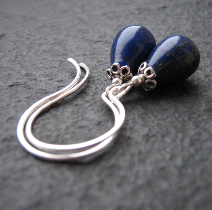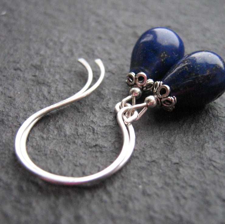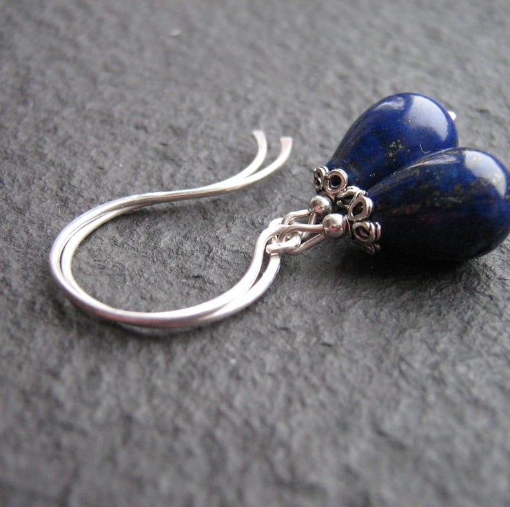These gorgeous midnight blue beads of lapis lazuli measure 9mm across and hang from handcrafted sterling silver ear hooks to make these stunning drop earrings. All metal parts are of sterling silver. The overall drop length is approximately 37mm.