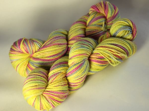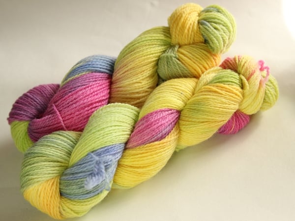 Hand painted in shades of bright lemon yellow with lilac, and pink and hints of green. These are a big, squashy, soft skeins of two-ply merino sport/sock yarn - despite its huge appearance it works up as a thick-ish sock yarn. is one skein left.