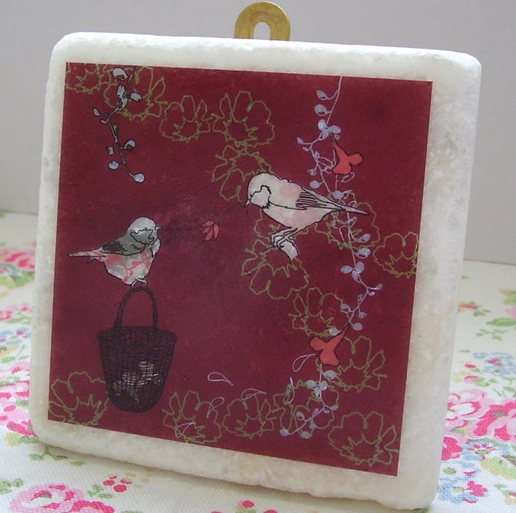 white marble tile featuring an original 'littlebirdy' design to hang on your wall!