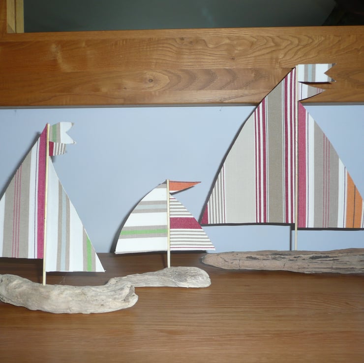 I saw three ships come sailing in! These colourful creations are made to order so each set is unique. We collect driftwood from our local north Devon beaches, and assemble the sails from our stash of vintage and recycled fabrics. Perfect to bring a sense of the seaside into your home, these are a particularly popular choice with owners of holiday homes. Your choice of sizes and colours - just get in touch.
