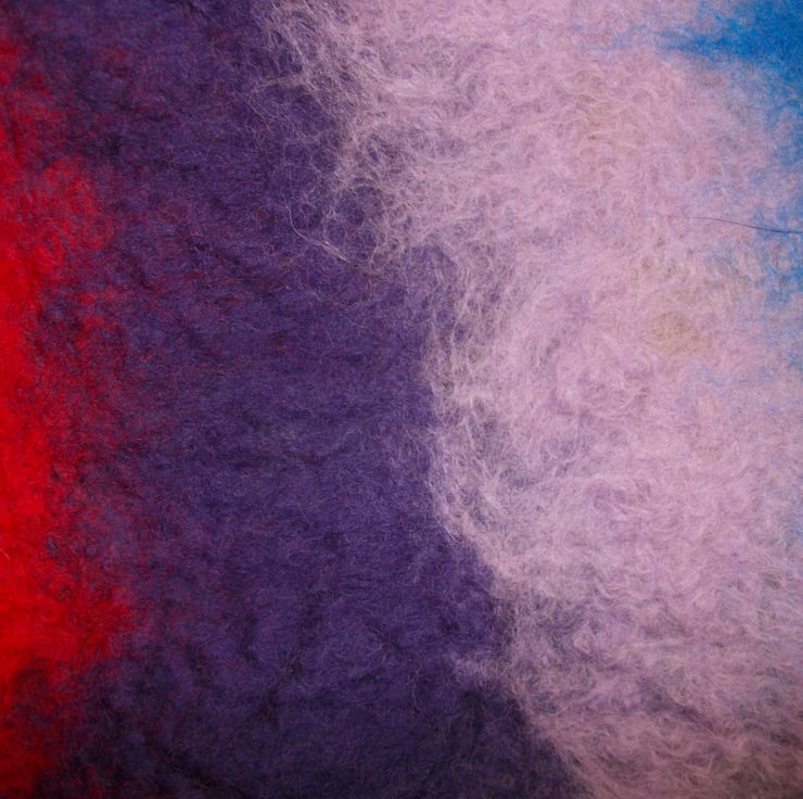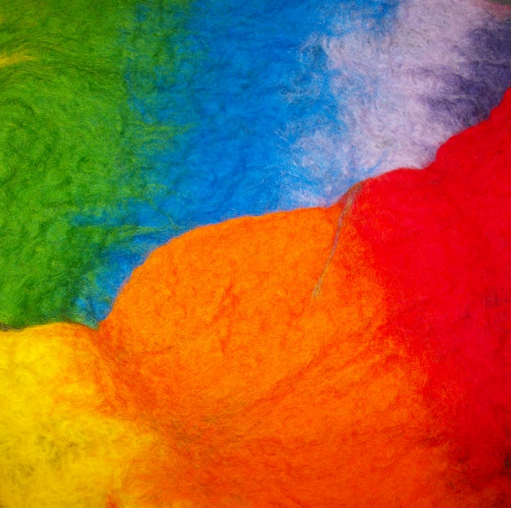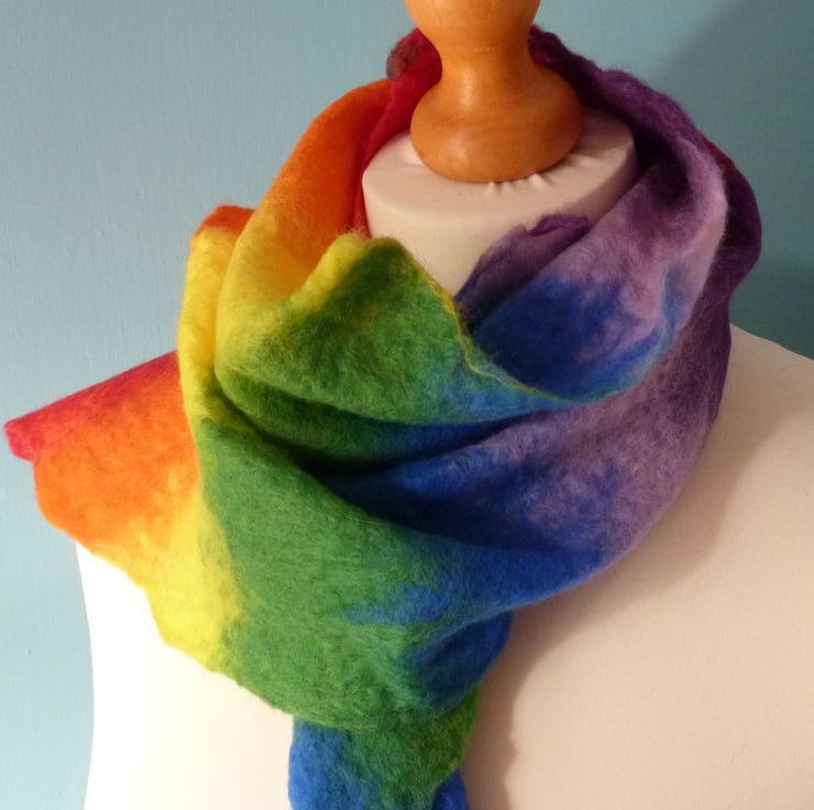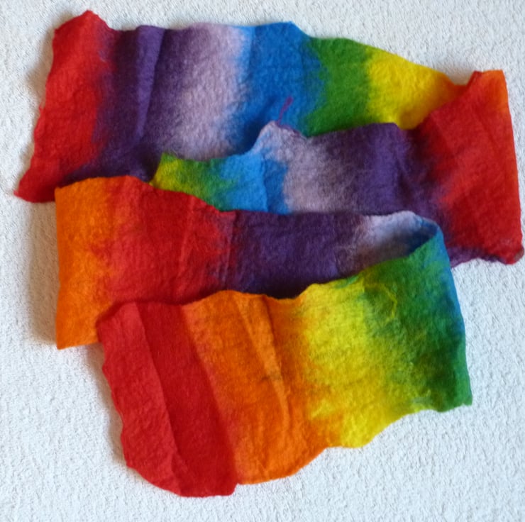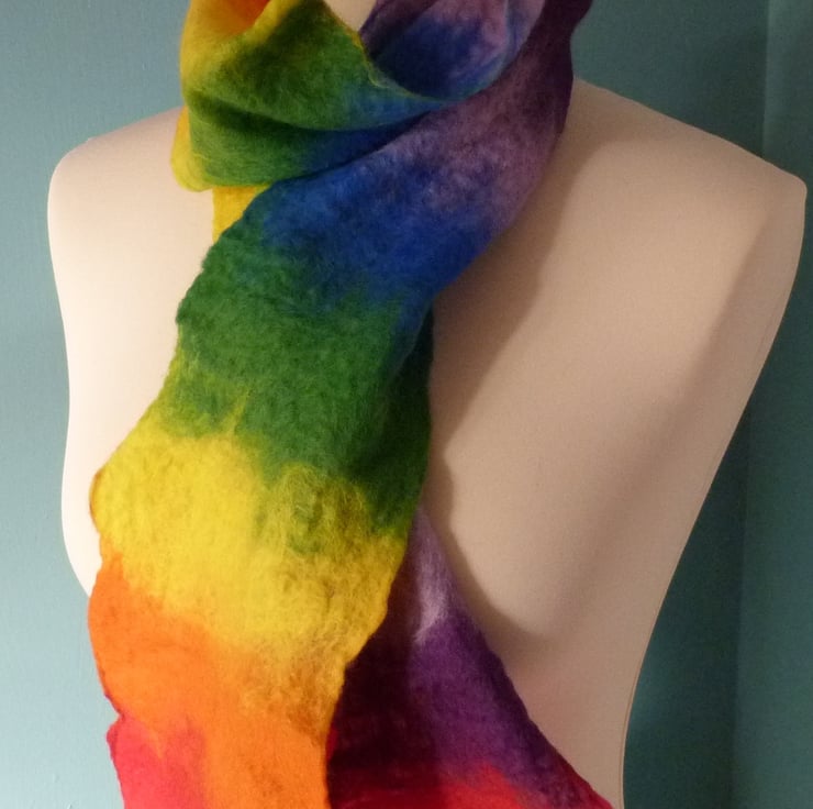 Cobweb lace felt is very fine and lightweight with small holes and transparent areas being a design feature. This is a very soft, lacy, feminine scarf made by the wet felt method, using merino fibres in all the colours of the rainbow!