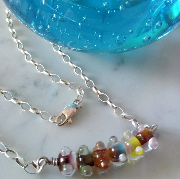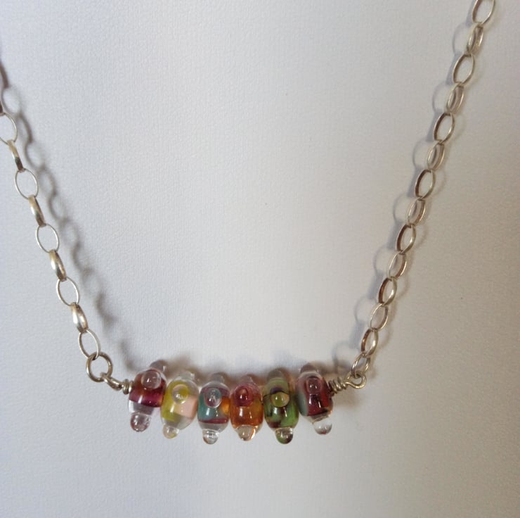 THIS IS A REALLY LOVELY NECKLACE WITH 6 9MM PIXIE LAMPWORK BEADS. THERE IS NEARLY EVERY COLOUR YOU CAN THINK OF IN THEM.