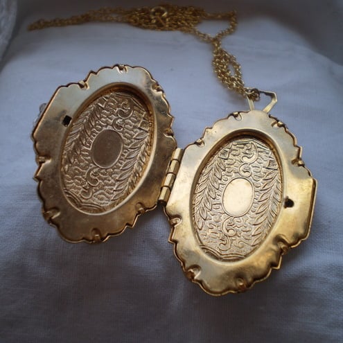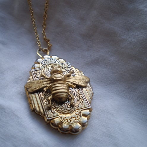 An ornate Vintage goldtone engraved locket is the resting place of a friendly Bee. Lovely Cathederal arch design with pretty engraving to the inside where you can display photos.