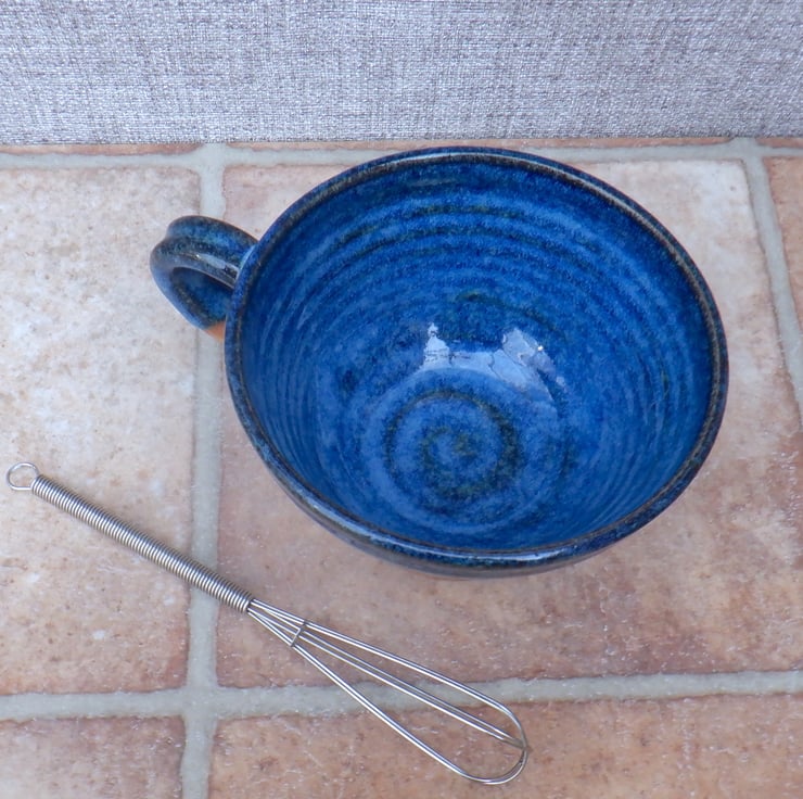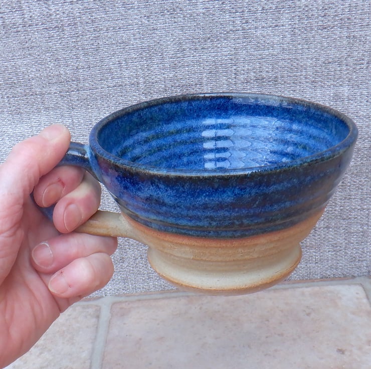 I threw this large cocoa mug on my pottery wheel using strong toasted stoneware clay, and finished it in a pretty cobalt royal blue reactive glaze.