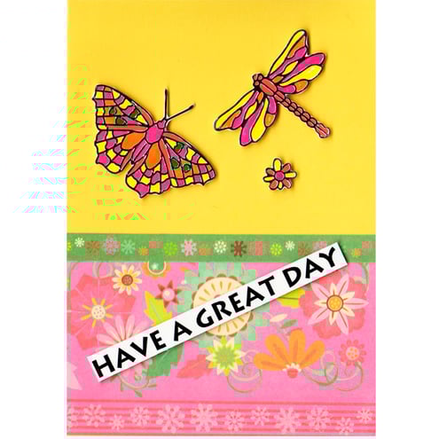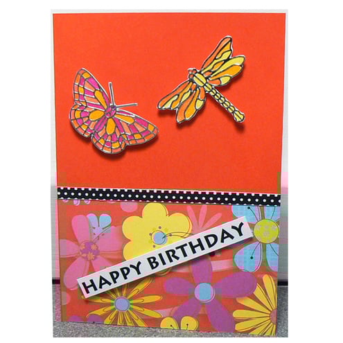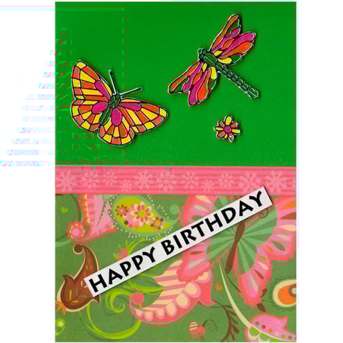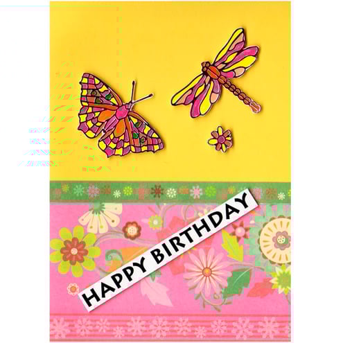 A6 primary coloured cards with brightly painted 3D butterflies and dragonflies, toning patterned paper and greetings strip. Please note paper designs may vary slightly.