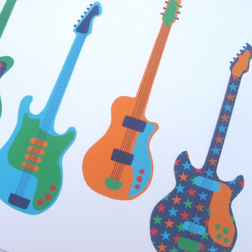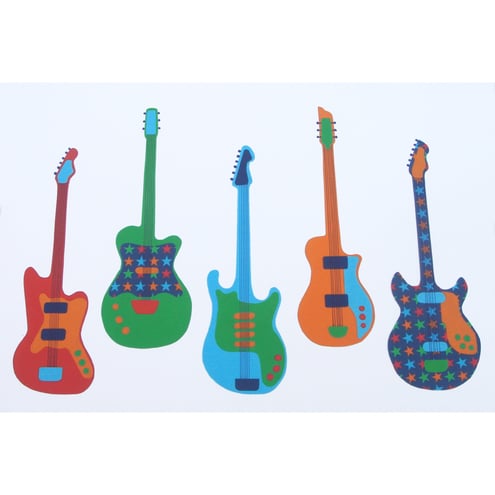 This fab guitar picture features 5 different guitars, all hand cut from brightly coloured plain and patterned paper, then carefully mounted on thick card.
