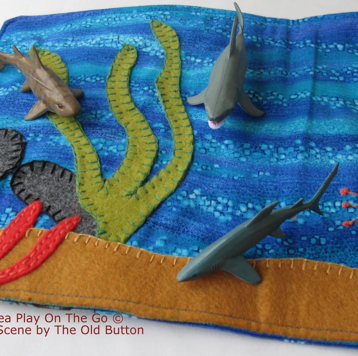 Under the Sea is a striking play scene, hand made with wool felt motifs that have been hand and machine embroidered onto a watery backdrop create a gorgeous under the sea habitat, complete with a cave like pocket for your child's little shark, fish or even mermaid toys.