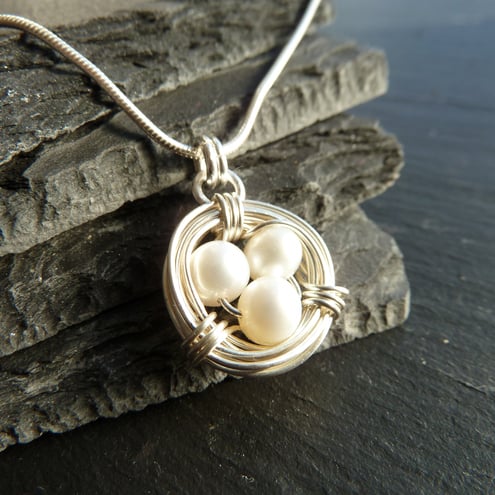 Three delicate, white, freshwater pearls huddle together in a sterling silver nest. This wire-wrapped nest pendant hangs from an 18 inch Sterling silver snake chain. This necklace is perfect for a bride or new mother.