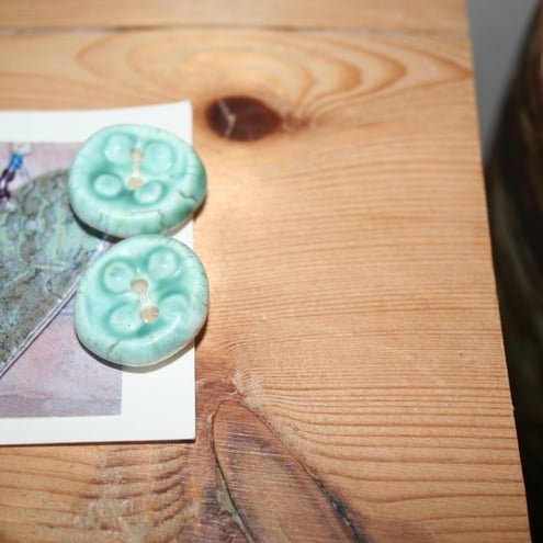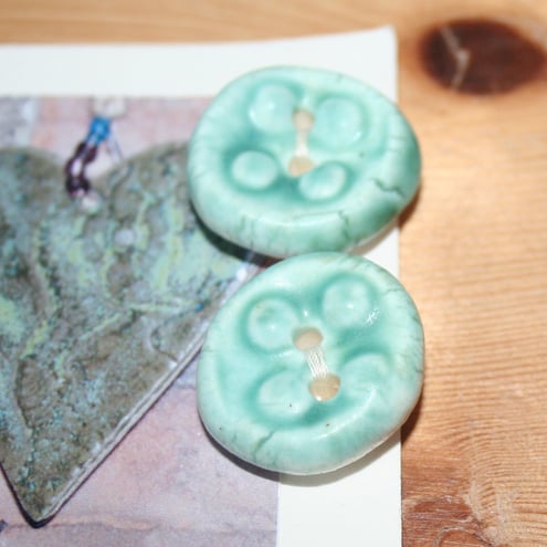 Handmade stoneware textured ceramic buttons finished in light green glaze, ideal for adding to hats, bags & textiles.