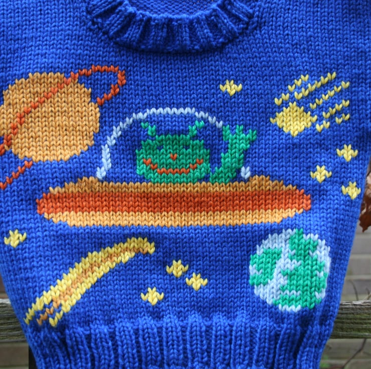 Aliens in Space is a written knitting pattern in pdf format for a toddler's jumper.