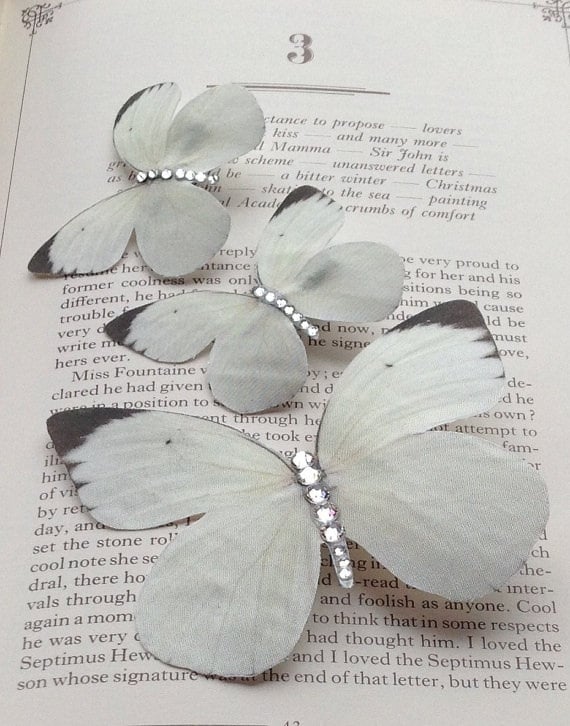Delicate little silk butterflies, printed on raw silk which gives them a realistic textured feel. Finished with a little Swarovski crystal for added twinkle!