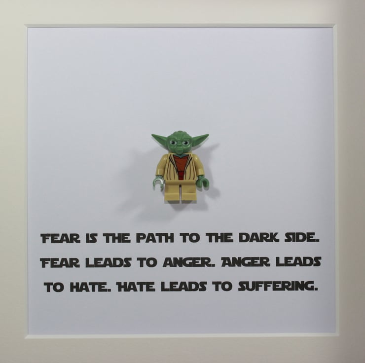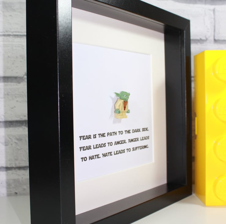For those who prefer the light side we present our littlest Jedi master framedup - the loveable Yoda. He has been mounted in a deep box frame and features the classic quote from the movie "Fear is the path to the dark side..."