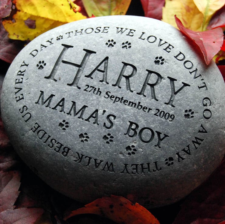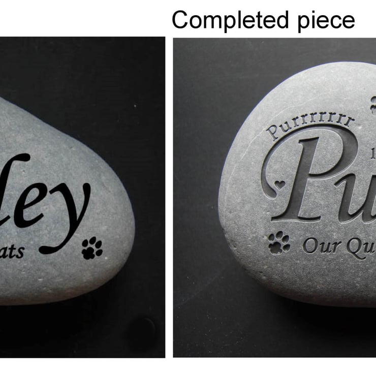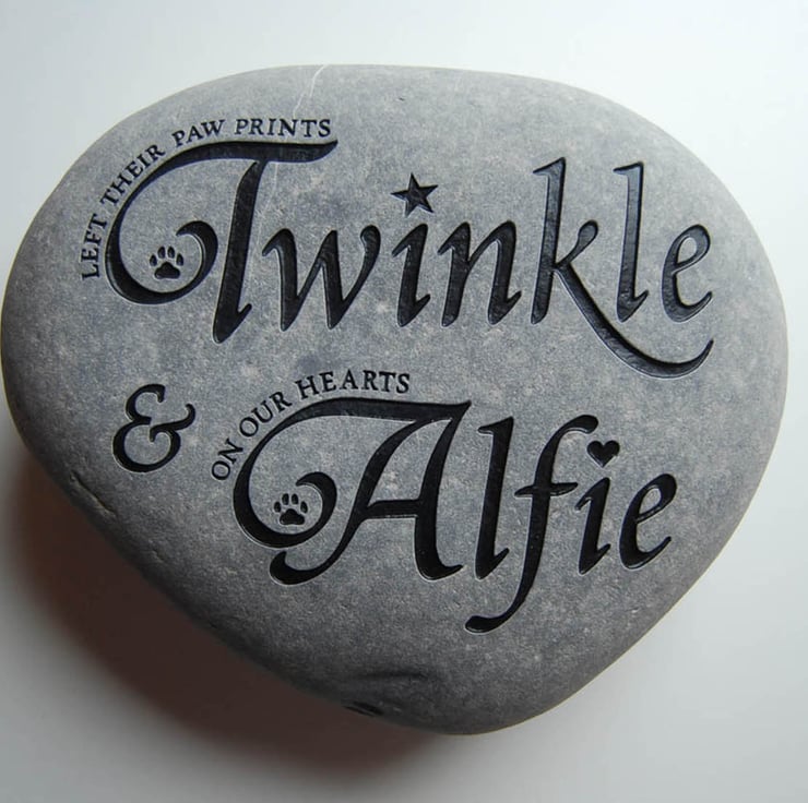 When I lost my cat Elliot 10 years ago, I was very unhappy to find the majority of pet memorial stones for sale were very impersonal and a bit depressing. They were often not engraved deep enough or also made with composite plastics open to deterioration. I didn't want this for my Elliot! I wanted a beautiful cat grave marker for him, a rustic stone tribute that would last as long as the tree his ashes are buried beneath. I wanted his memorial headstone to be as individual as he was and not just something picked 'out of the box'. Mostly, I wanted his memorial to remind me to be happy and not fill me with sadness every time I saw it. So I set about making it myself. Word of mouth soon had me designing and engraving memorial stones for other people and I haven't downed tools since. Over the last 10 years I have engraved custom memorial stones for the loveliest of people. I have been sent many wonderful photos to put faces to the names - everyone as individual as my Elliot.