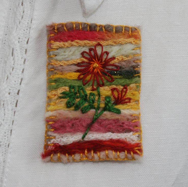 Various yarns and wools are felted to a commercial felt background using an embellisher machine. The flower is stitched in cotton threads. The brooch is edged in blanket stitch in a golden yellow cotton.