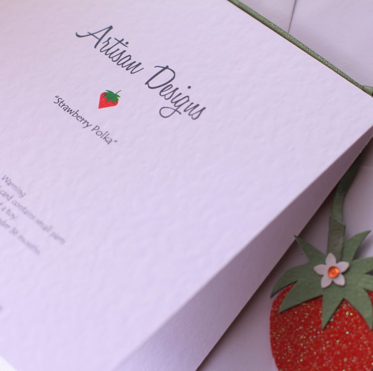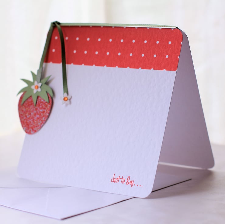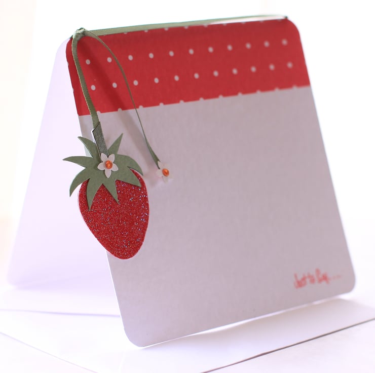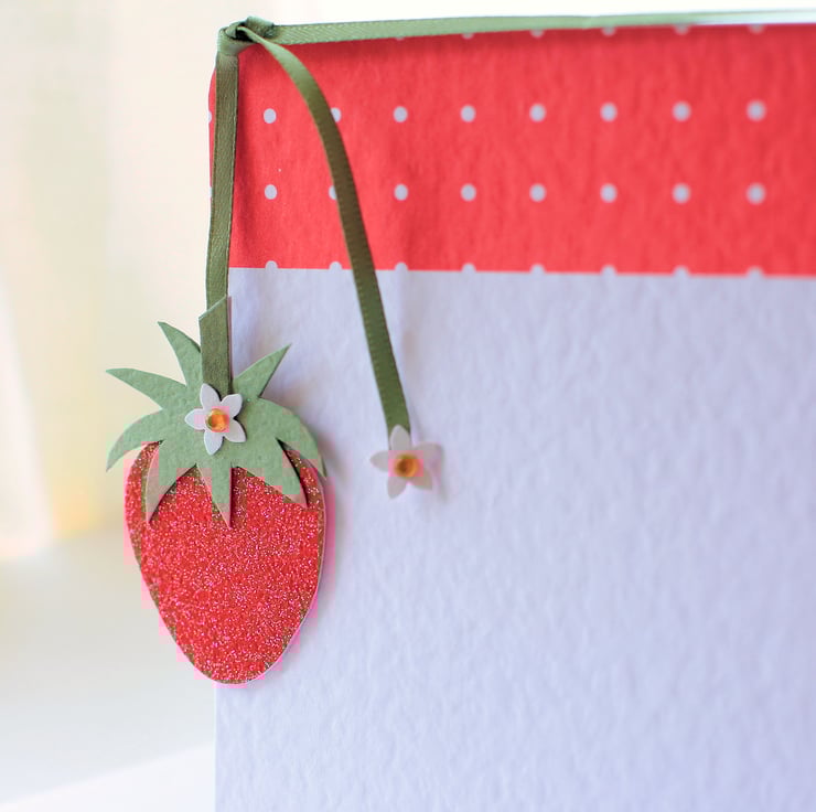 This cute retro inspired greetings card with its dots and rounded corners, features a handcut double sided glittery strawberry and blossom which are designed to dangle over the front of the card from a ribbon which is tied along the spine.