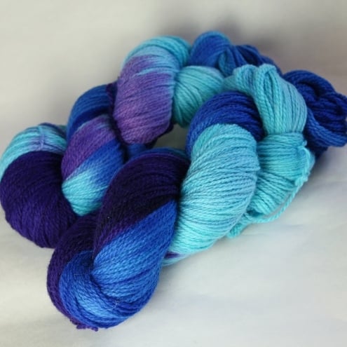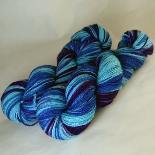 Shades of aqua/turquoise, blue, lilac and deep purple. These big, squashy, soft skeins of two-ply merino sport/sock yarn (despite their huge appearance) work up as a thick-ish sock yarn/light DK. The yarn has been reskeined as shown in the first two photographs, but is shown in the third photo before reskeining, for reference only. There is one skein left.