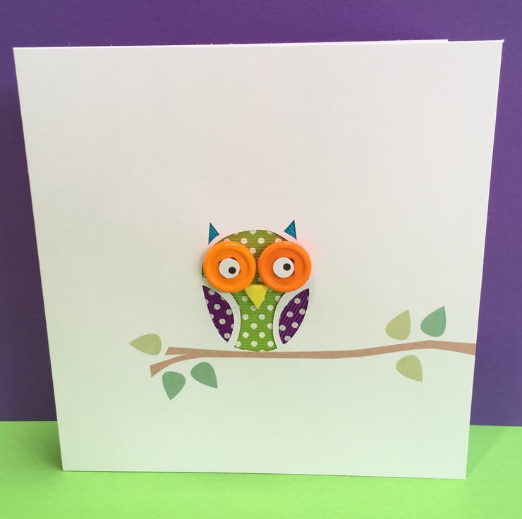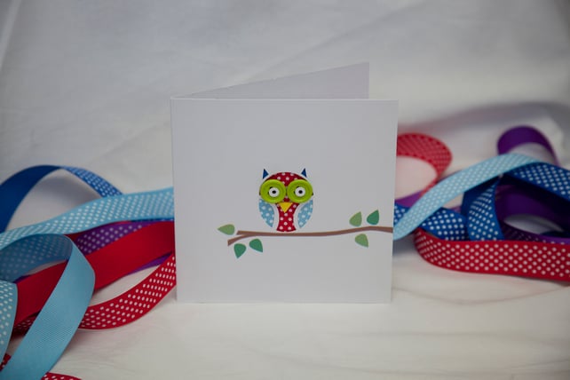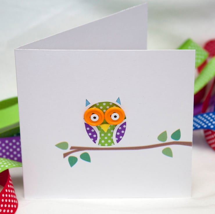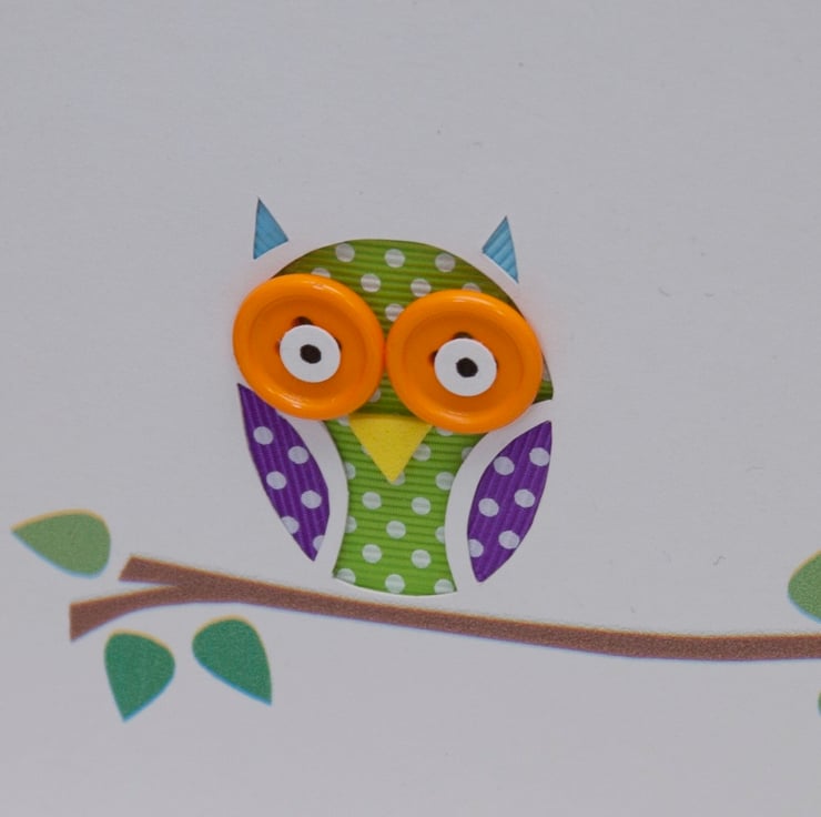 This loveable owl card has been handcut to reveal it's polka dot ribbon feathers and finished with button eyes and a foam beak. Please let me know if you have a colour preference.