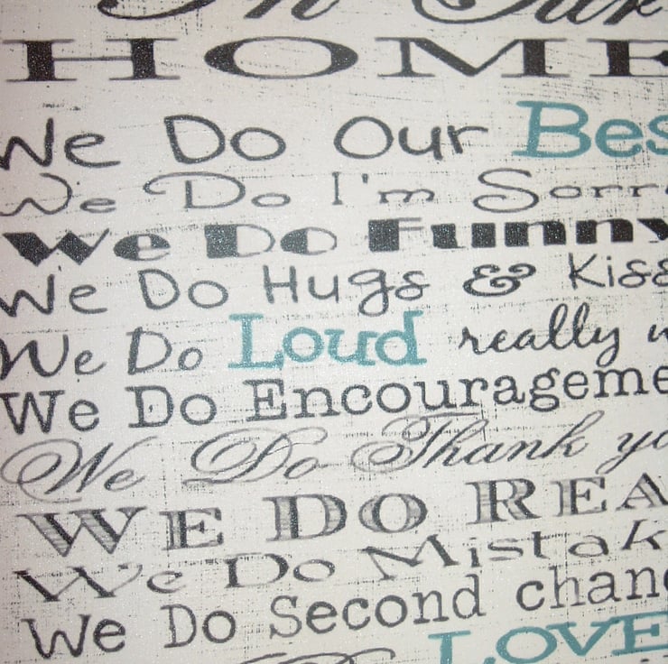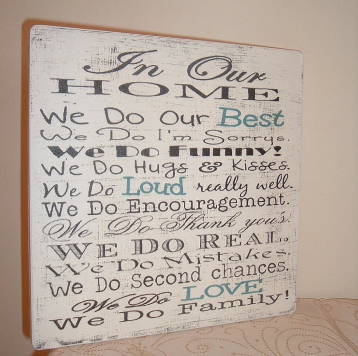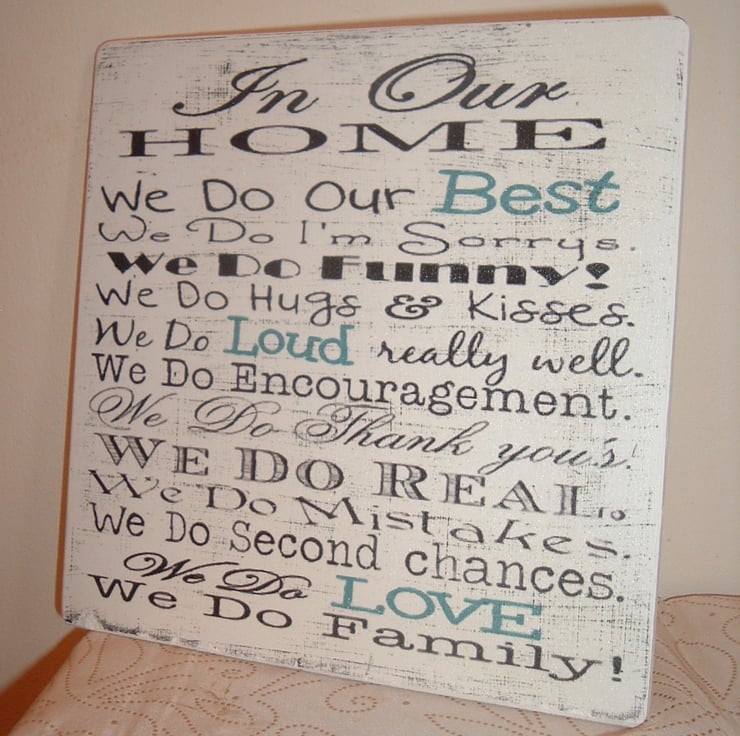 lovely plaque sign approx 8 x 8 inch painted in antique white,and distressed, in our home we do....supplied with hanger should you wish to hang, i am able to change the blue wordings to a colour of your choise if you so wish, thank you