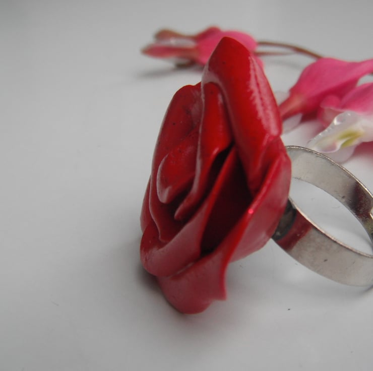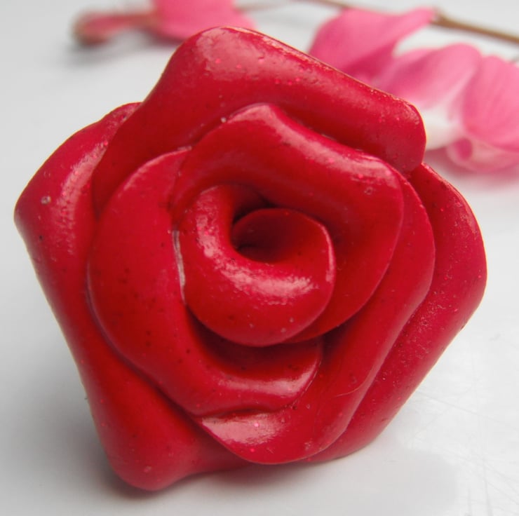 This is a hand crafted polymer clay rose, made from red glitter fimo, which is attached to a silver tone adjustable metal band. Matching items available.