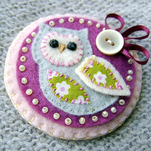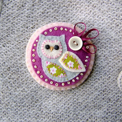 This is a lovely handmade fabric brooch. It features a little owl with appliqued wing and belly. It is mounted onto a circular felt base which is edged with pretty beads. It is finished with a button and ribbon detail and has a brooch backing for easy attachment.