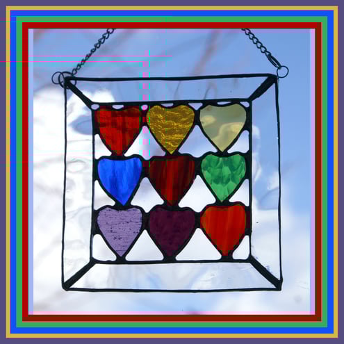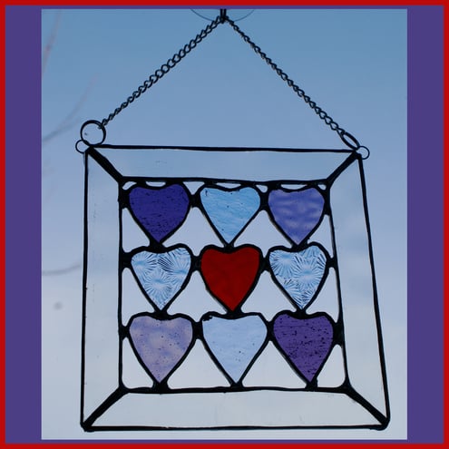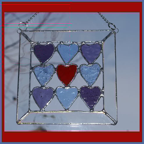 The ¾ inch ‘frame’ is made of gently waved clear glass which has a lovely movement in the light. Inside this is a ‘picture’ containing 9 hearts – 1 bright red & shiny in the centre, then 4 blue and 4 purple hearts round it with different textures and shades to give the picture life. I am really pleased with this new design. It looks super hanging in the window where the colours of the hearts change according to the direction and strength of the light shining on them.