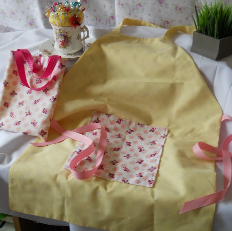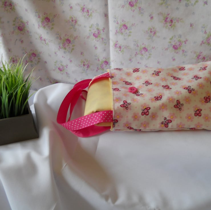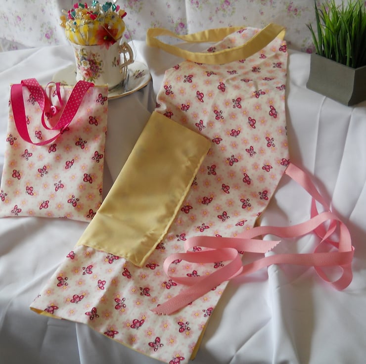 An adorable colourful apron for Mummy's little helper. This mini pinney is made of cotton fabric. the straps are made with grossgrain ribbon. It is reversable which is a bonus as it's like having two aprons for the price of one. It comes with a matching carry bag. I will be listing more of these in different fabric combinations. If you want more than one pinney please contact me I am more than happy to take orders.