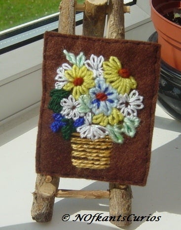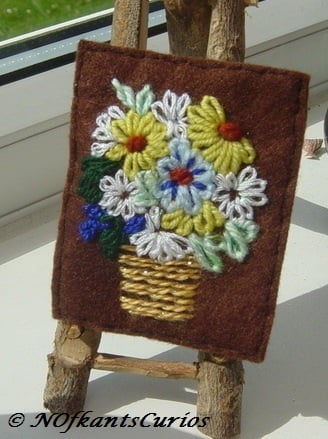 Vibrant Bouquet is an embroidered yarn and felt ACEO, featuring embroidery on a double layer of deep brown felt, which is then edge thread sewn, to ensure minimal cotton and yarn workings can be seen from behind.