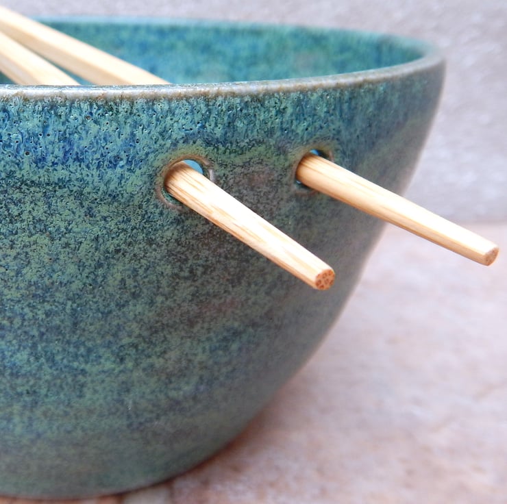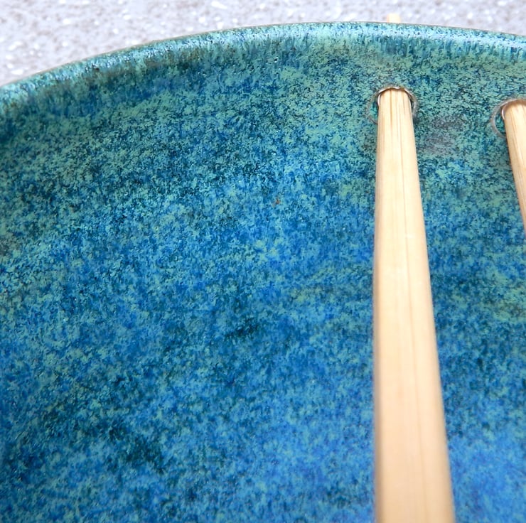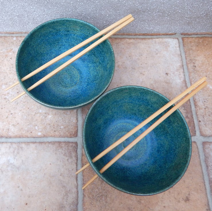 This noodle or rice bowl was thrown on my pottery wheel using strong white stoneware clay, and finished in a lovely combination of blue and green matt reactive glazes.