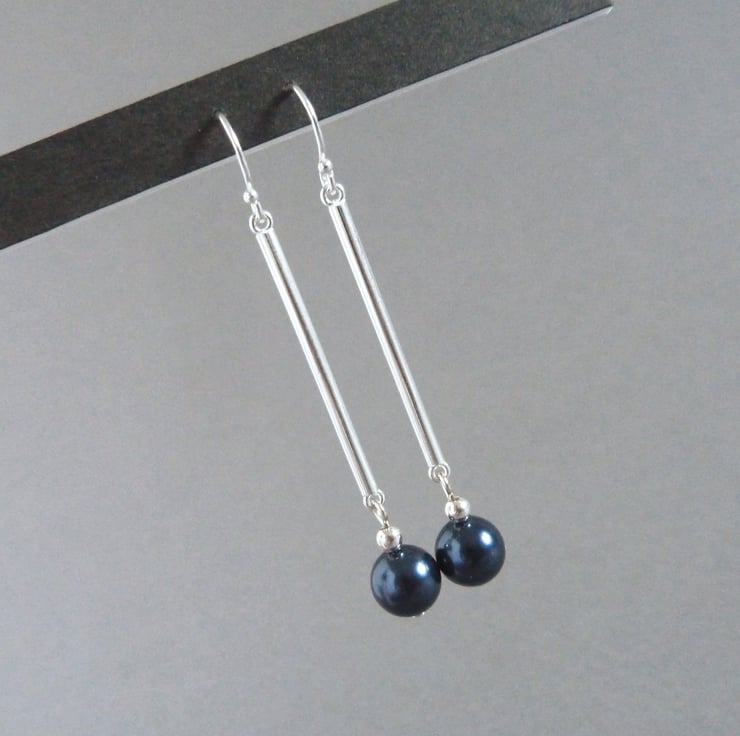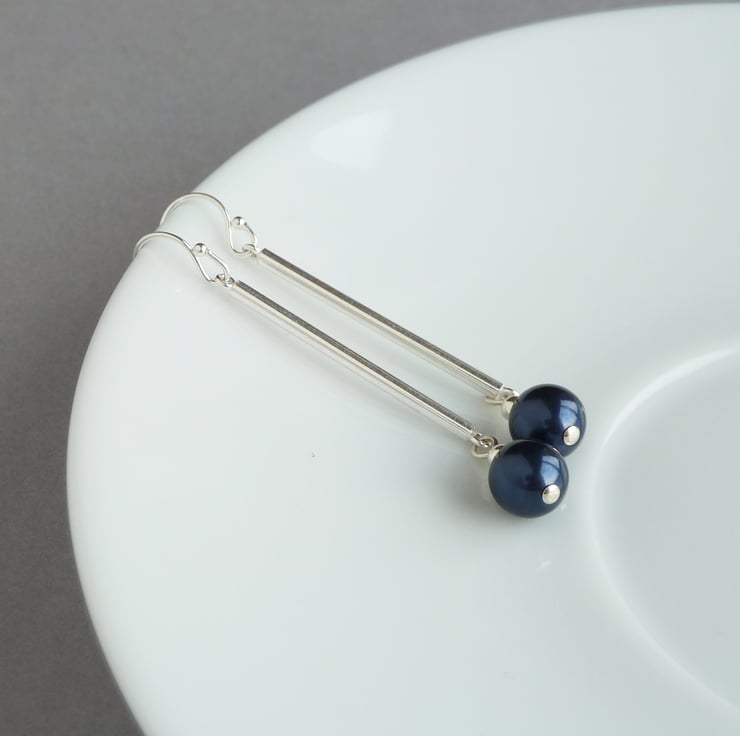 8mm midnight blue glass pearls hang from Sterling silver bars to create these long navy dangle earrings. Simple in design and muted in colour, these dark blue pearl earrings will never go out of style.