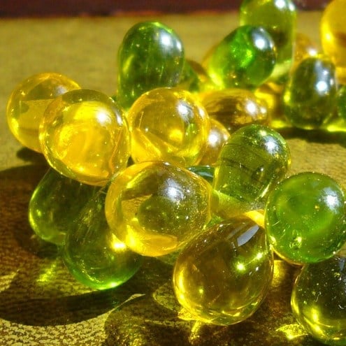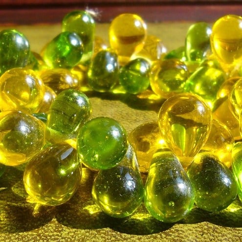 Czech pressed glass teardrop beads (alternate colours - green watercress and yellow mustard) threaded on clear elasticated thread.