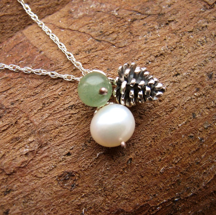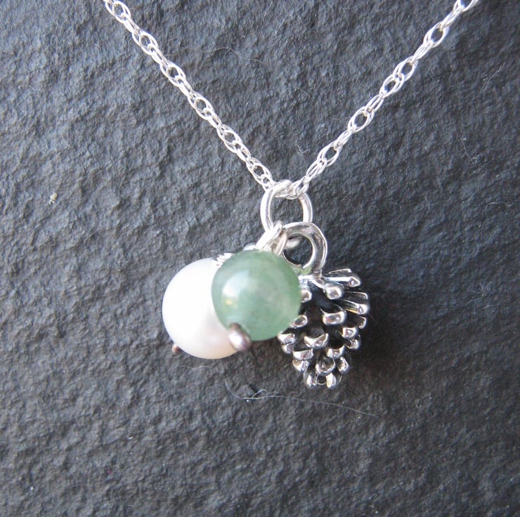 A lovely sterling silver pine cone charm hangs amongst an ivory freshwater pearl and green aventurine bead to create this unusual pendant. The charm measures approximately 10mm in length and overall drop of the pendant is 25mm, and comes on a sterling silver chain (please state preference of 16 or 18" upon purchase).