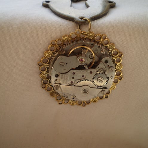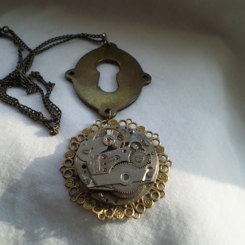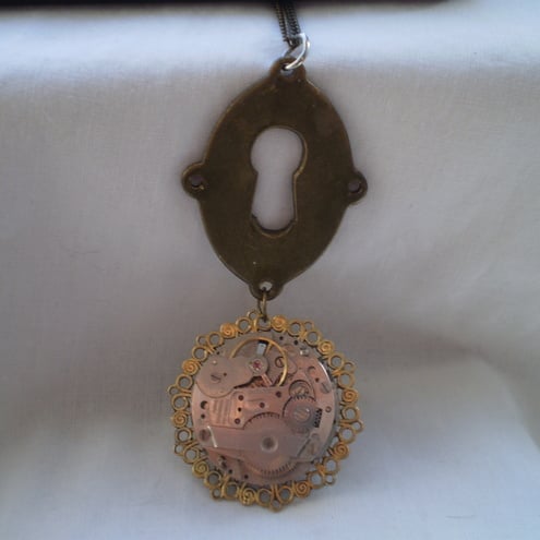 A Vintage keyhole is the centrepiece for this dramatic Steampunk necklace. A lovely filigree finding secures the vintage pocket watch mechanism beneath the keyhole. Bold enough to be the only piece of jewellery you will need to wear with any outfit.