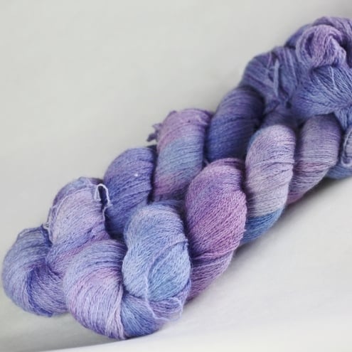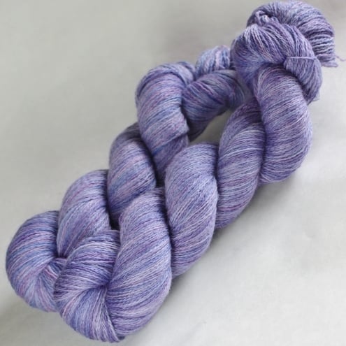 Sedate and soothing, slightly variegated lavenders ranging from lavender pink through lilac and lavender blue. This lustrous, lofty and slightly fuzzy yarn should make beautiful lace projects. It has been reskeined as shown in the first two photographs but is shown before reskeining in the third photograph, for reference only. There is one skein left.