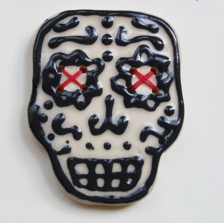 Around each eye there are 4 holes so you can sew the button onto your project. I've used red thread to sew it onto the backing card but you could experiment with any colour you fancied.