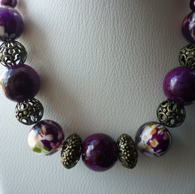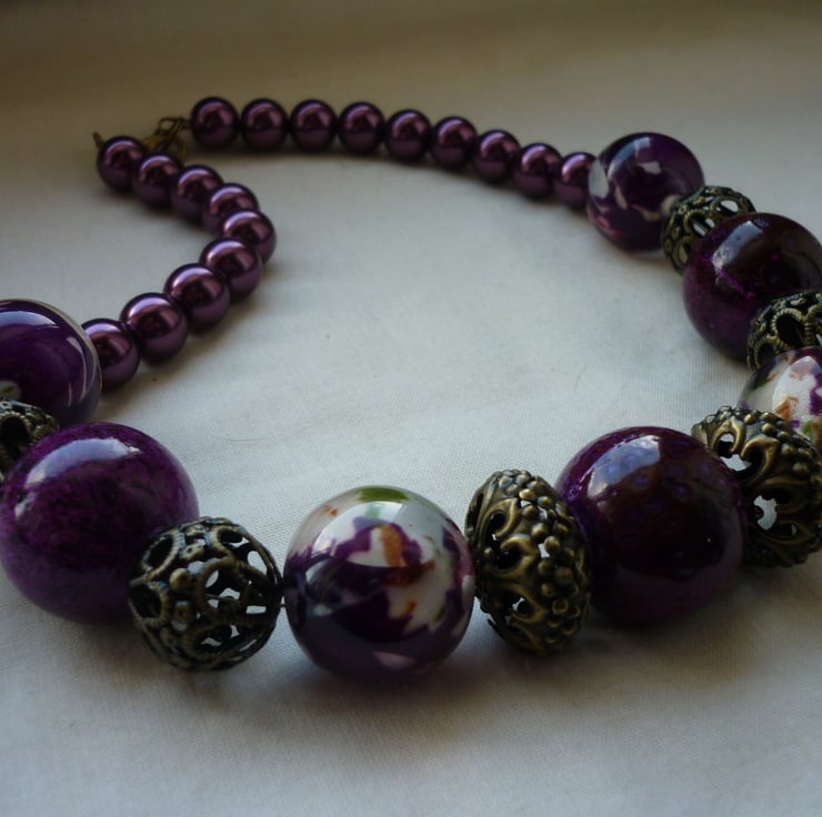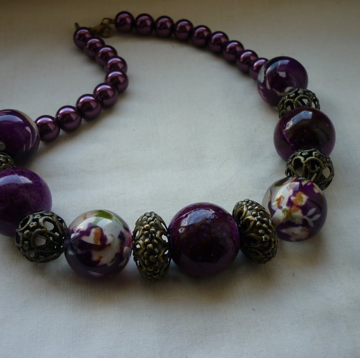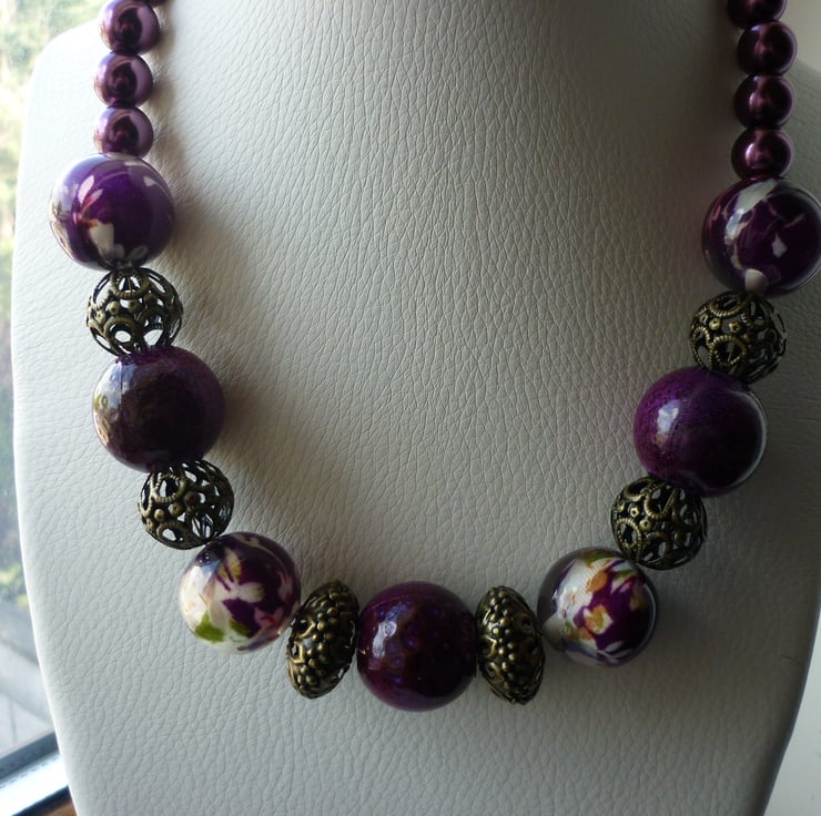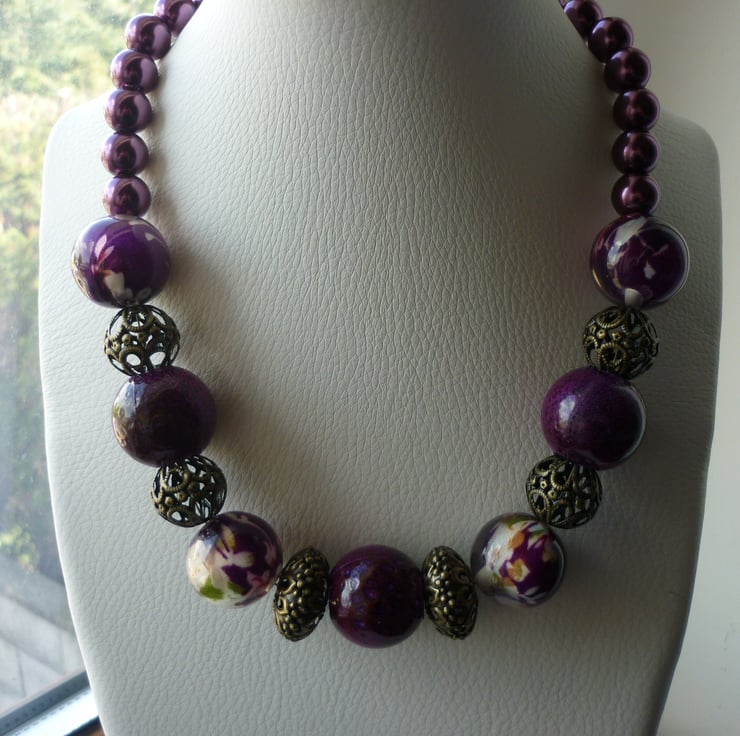 THE NECKLACE HAS BEEN MADE WITH CHUNKY ACRYLIC BEADS IN WINE WITH FLORAL PATTERN WITHIN, CHUNKY WINE ACRYLIC BEADS, ANTIQUE GOLD FANCY SPACER BEADS AND 12MM WINE GLASS PEARLS AND FINISHED WITH ANTIQUE GOLD LOBSTER CLASP AND FINIDINGS.