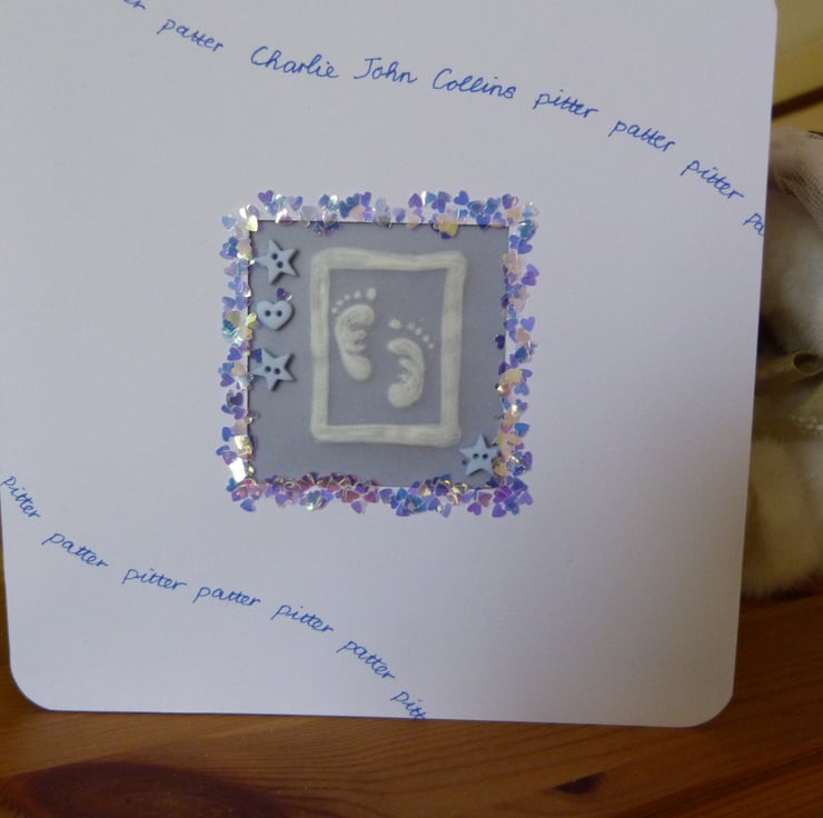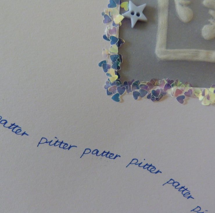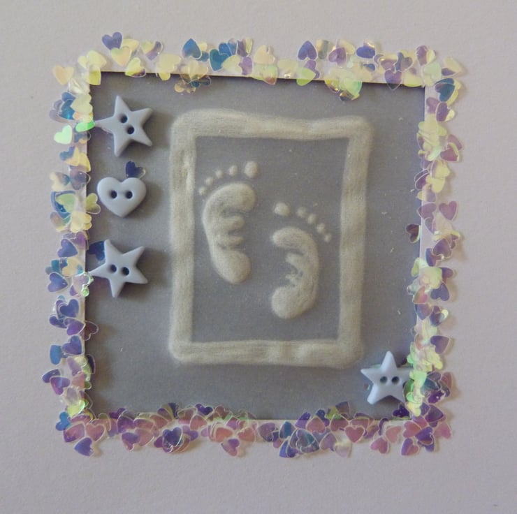 A pair of so cute tiny baby feet embossed onto parchment. Mounted into a rectangular insert in quality white card., Insert edged with tiny luminous hearts. Parchment decorated with tiny baby blue buttons. Card decorated with a weave of pitter patter and includes name of new arrival.