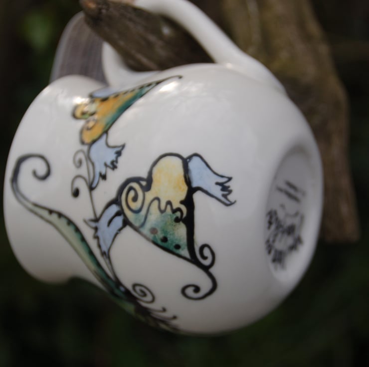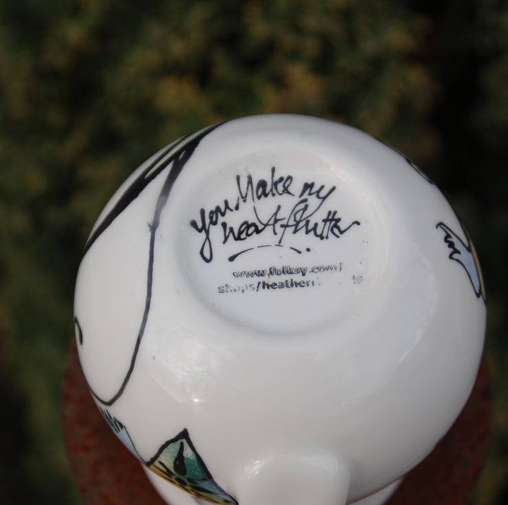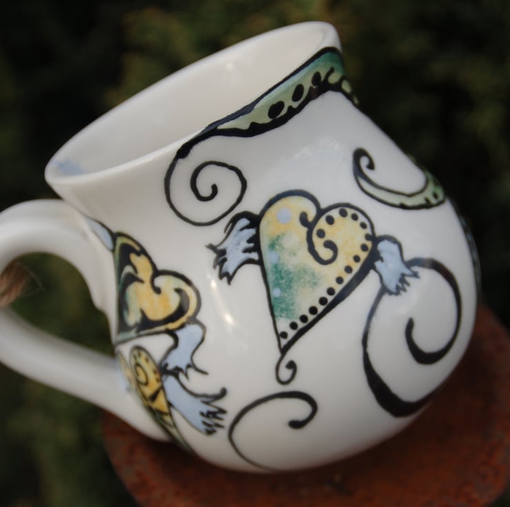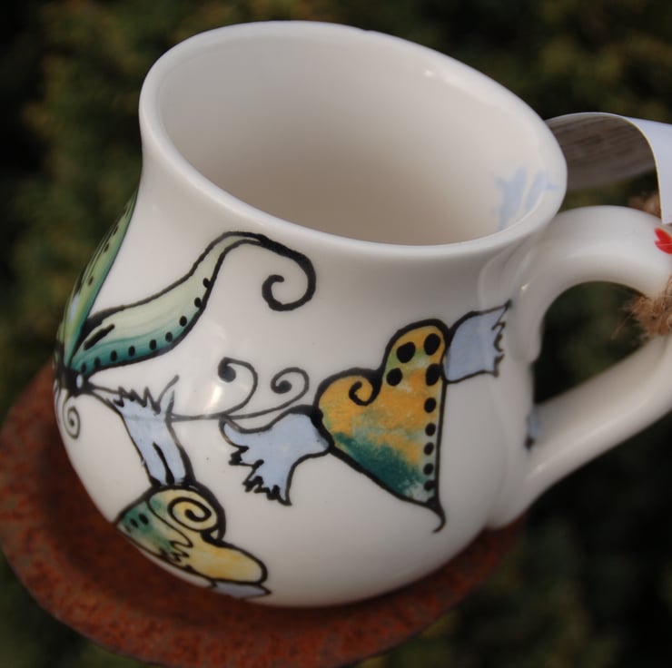 Retro heart mug with bold free hand painted butterfly design and flying hearts with light blue wings. This is a hand painted individual piece painted in food safe underglaze colours and glazed in lead free glaze. I fire to high earthenware temperatures and my pots are dishwasher safe.