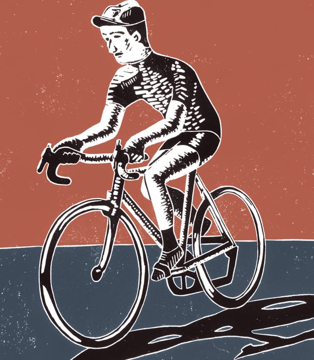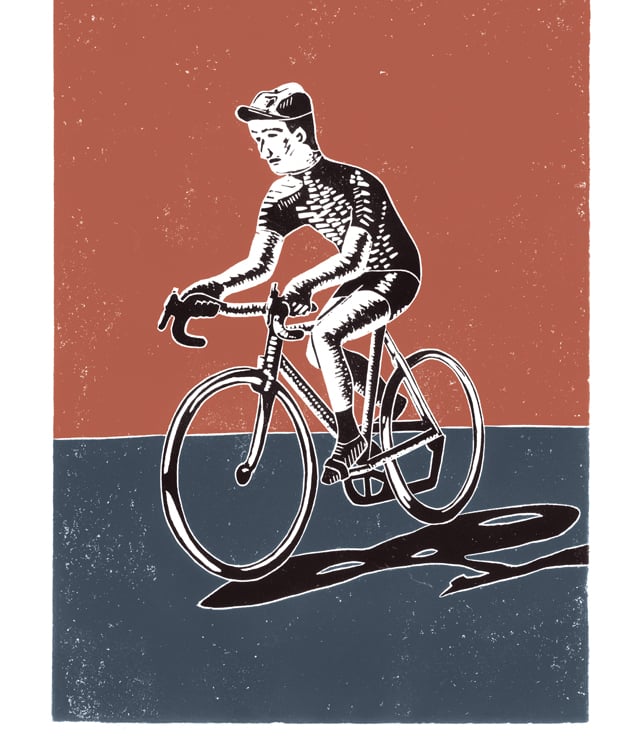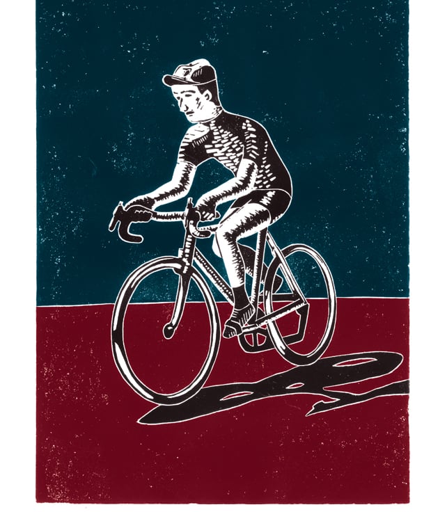 A3 (29.7cm x 42 cm) poster-print entitled 'The Cyclist' printed in dark orange, dark grey and teal.