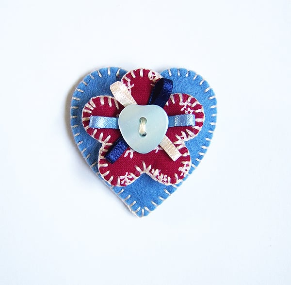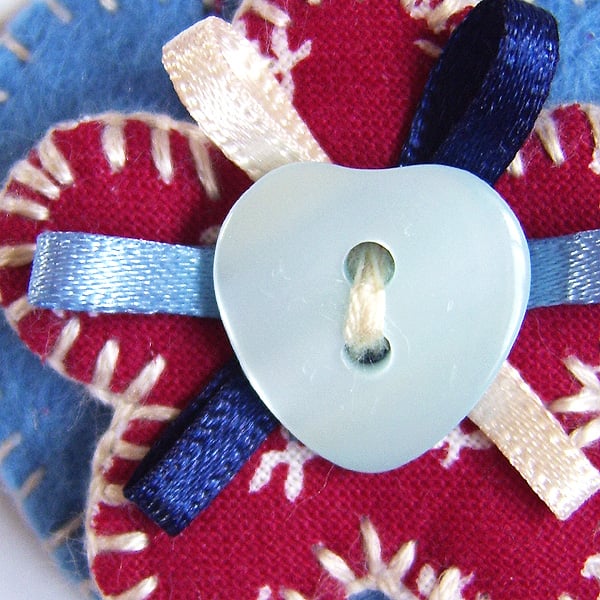It features a hand sewn applique flower in red cotton print fabric which is mounted onto a blue heart shaped felt base. The flower is finished with a blue heart shaped button centre with coordinating ribbon details. The base has cream blanket stitch edging and there is a brooch pin on the reverse side for easy attachment.