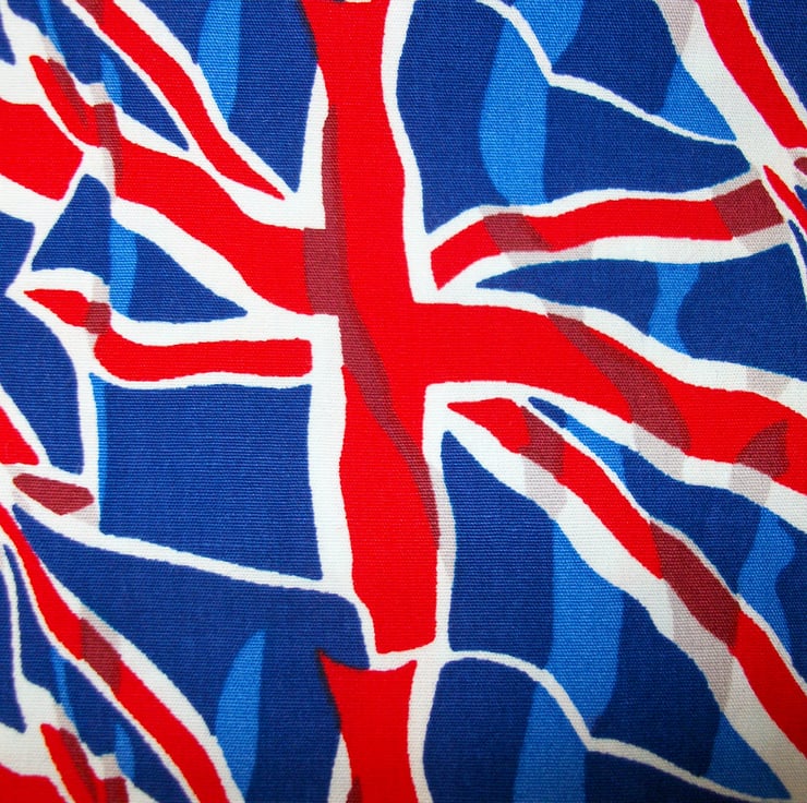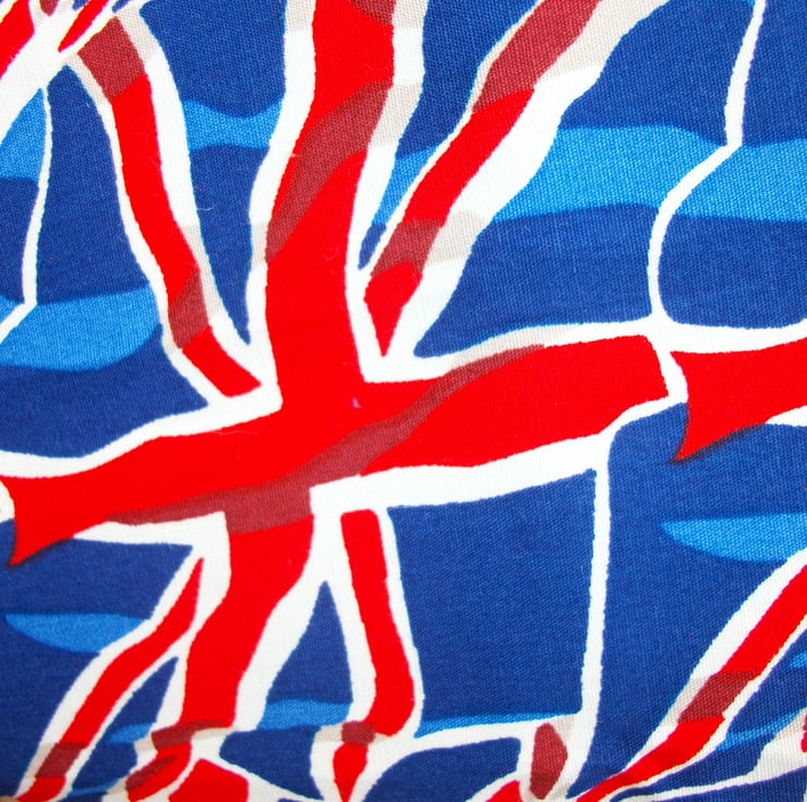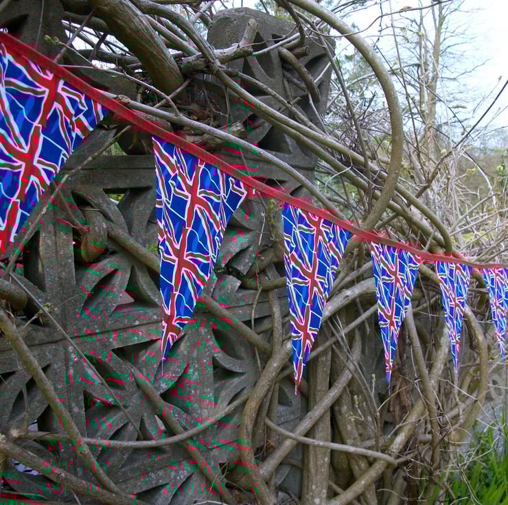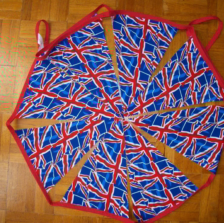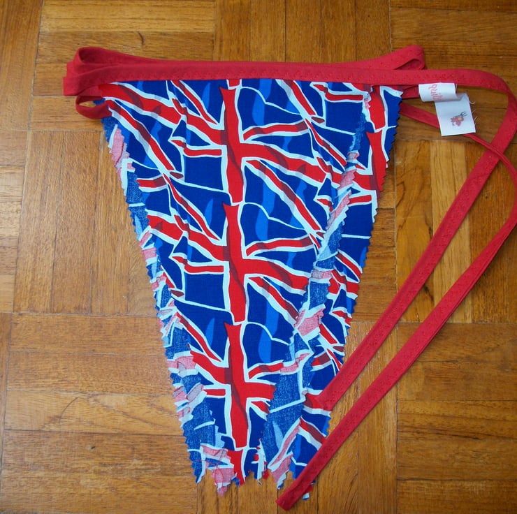 This bunting would be a great decoration for summer barbeques,camping trips or to use indoors. I have created the single sided bunting from union jack print fabric, all cut out with pinking shears. Each flag is 7" wide at the top and 10" long. There are 12 flags in total, spaced approximately 2" apart, with the total length of bunting measuring 3.5m. The flags are sewn onto a red bias tape.