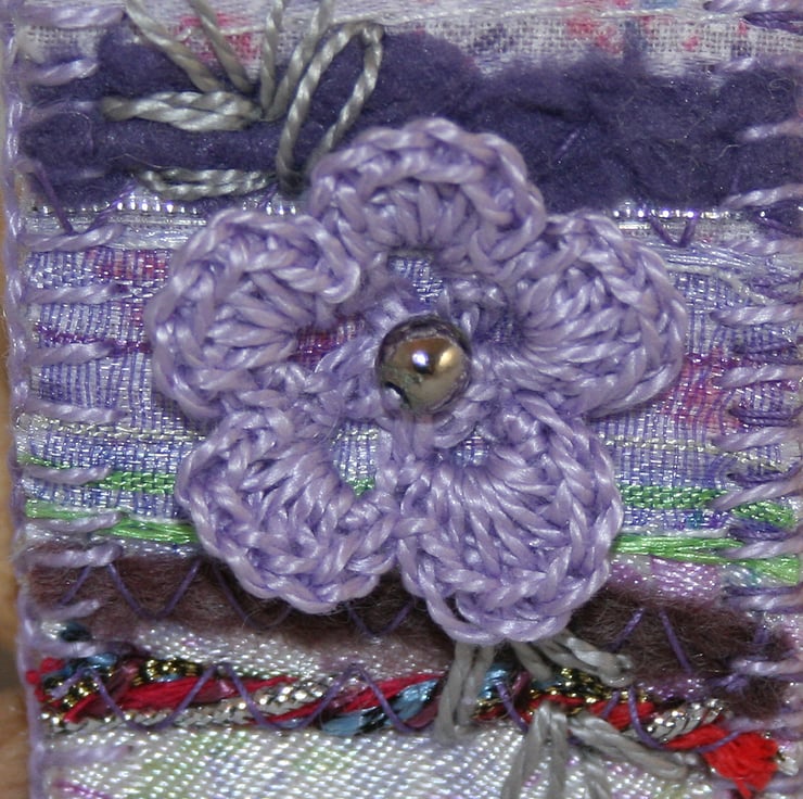 The background of this brooch is a patchwork of ribbons, embellished by couching over fancy yarns. A crocheted flower, with a bead center, and embroidered leaves, in cotton, is the focus of this textile design.