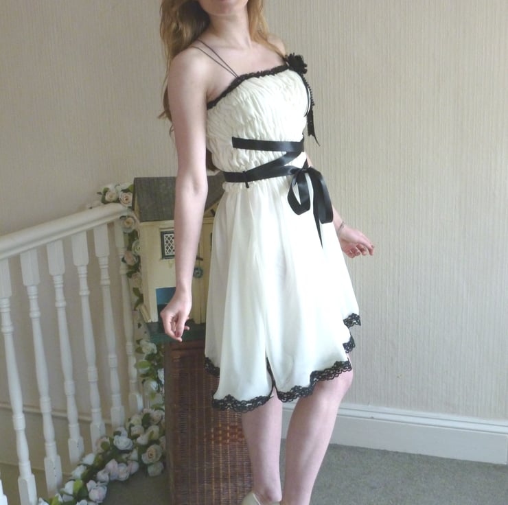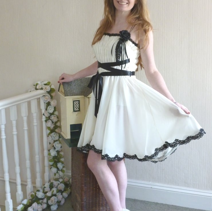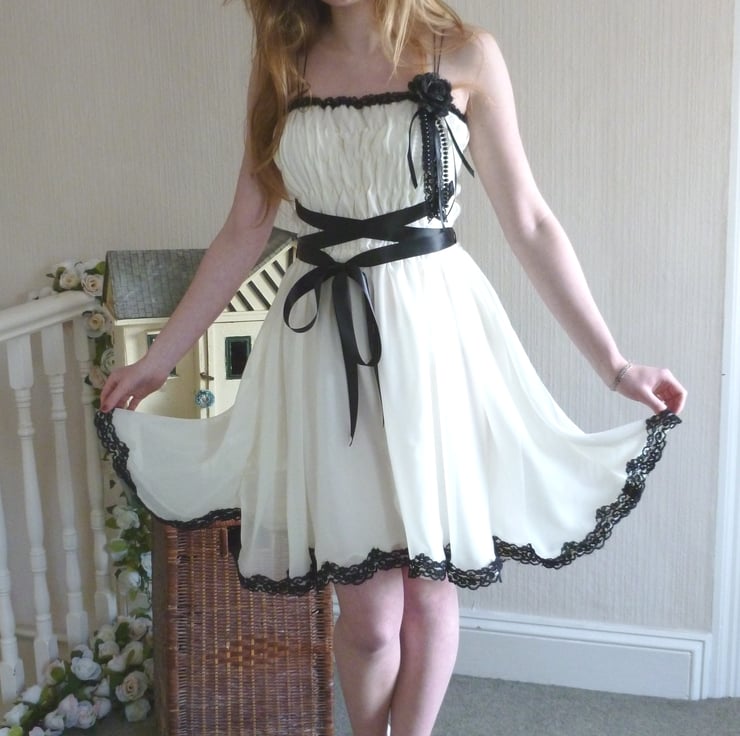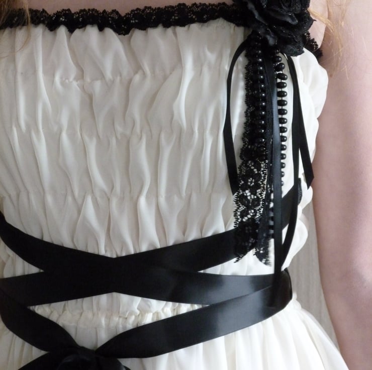 The dress also has a detachable black corsage with beaded,lace and dangling ribbons that can be pinned on at the top or waistline to add a really pretty and summery feature!