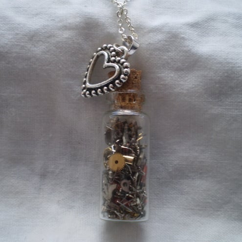 Capture Time in this little Steampunk glass bottle necklace. It has 100's of tiny vintage watch components locked away for all time. The top has a cork which is stuck fast to prevent the past coming into the future. A pretty heart charm hangs from an 18 inch silver plated chain.