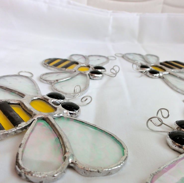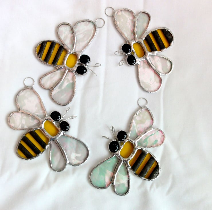 Here are some lovely sun catchers in the shape of a bee made out of beautiful stained glass.
