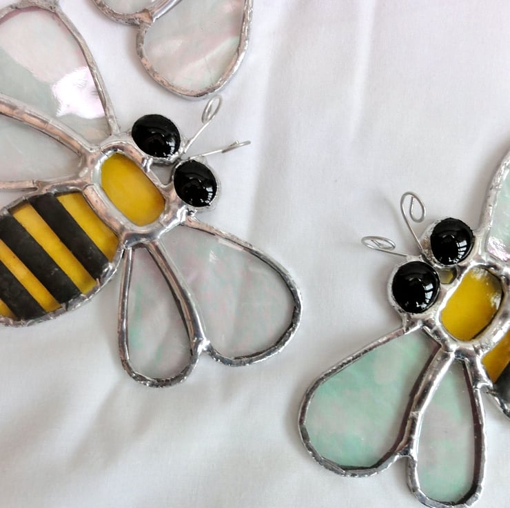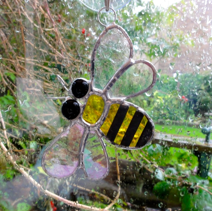 Each piece of glass has been cut, ground, foiled and then soldered together. The glass used is yellow water glass, clear irridised granite back glass, black glass nuggets for the eyes. Additional strips of copper foil have been laid across the body of the bee, soldered and then a patina applied to blacken the solder. Wire has been twisted for added detail on the antenna and a wire ring added for hanging purposes.