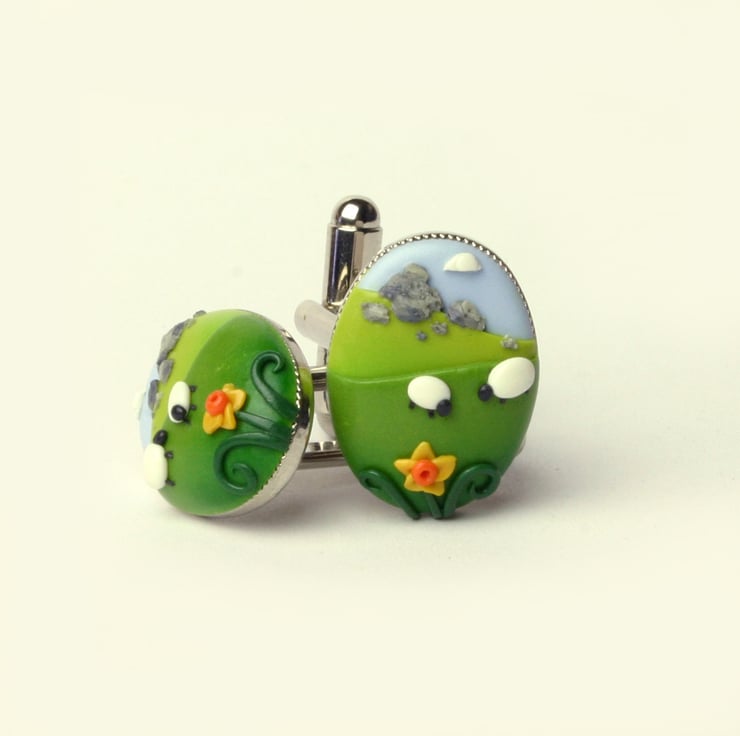 These oval cufflinks are based on typical scenes from Wales, complete with Sheep and Daffodils. A must have for any welsh boyo!