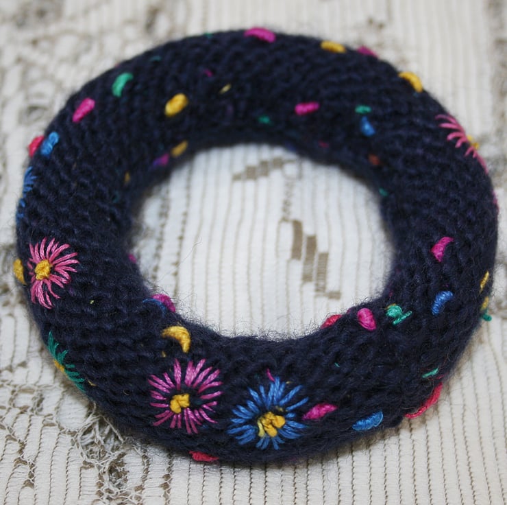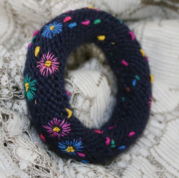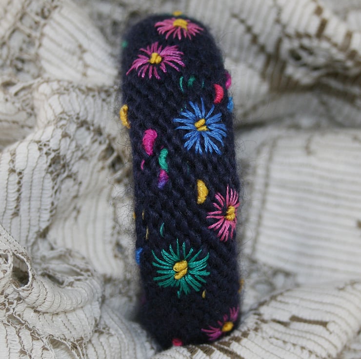 The background of this bangle is knitted in a wool blend yarn in a navy with coloured slubs of thread. The daisies are hand stitched in embroidery threads, carefully chosen to match the colours of the slubs in the yarn - scattered at random around the bangle. The knitted panel is bound around a core of up-cycled fleece fabric - cut from the sleeve of a sweater. This give a soft, light weight and comfortable feel.