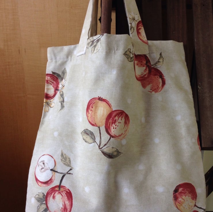 This a lovely shopper or book tote The bag is made with fabric made in the UK and consists the apple and blossom print outer with blackberry pocket on the front. I have lined it with navy and white spot fabric to complement the blackberry theme. Bag measures approx 38 by 41cm and the handles are approx 43cm long.