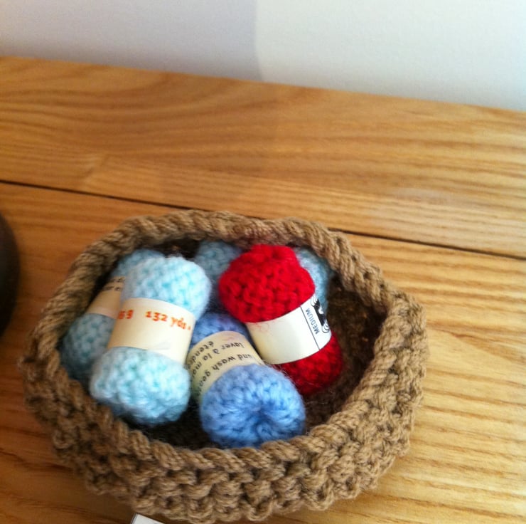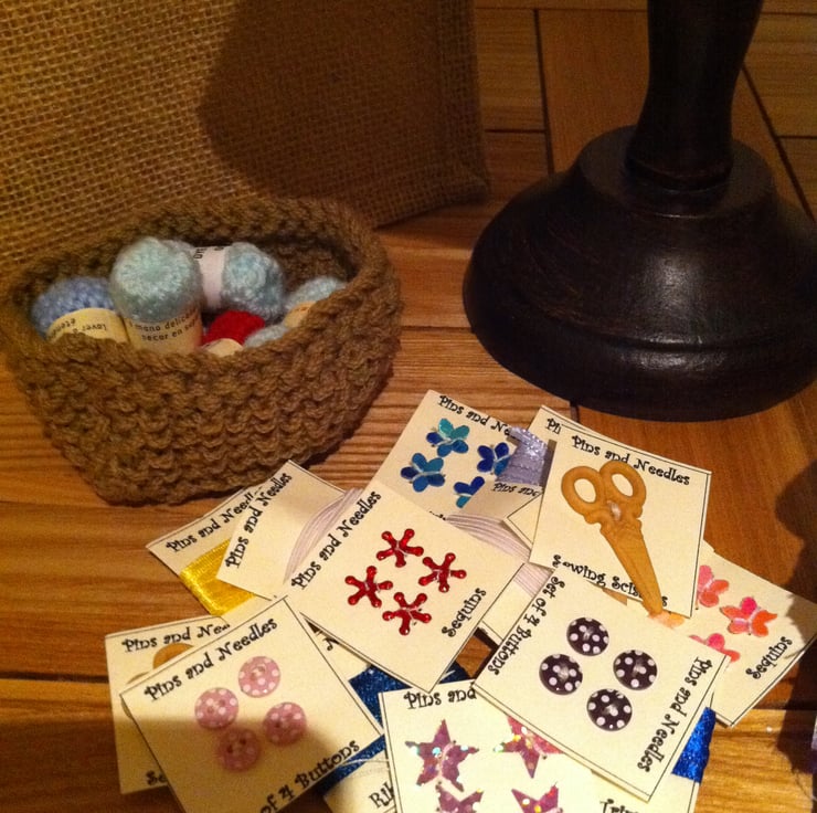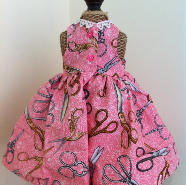 A really lovely outfit for a Maisy Muffin doll - a pretty pink sleeveless dress covered in tiny pairs of sewing scissors and decorated with tiny pink buttons and a lacy collar. With the dress comes a play set of little sewing items - some pretend bales of fabric, tiny cards of buttons, ribbon, elastic sequins etc and a little knitted basket full of tiny balls of wool. A set that will delight any little girl.